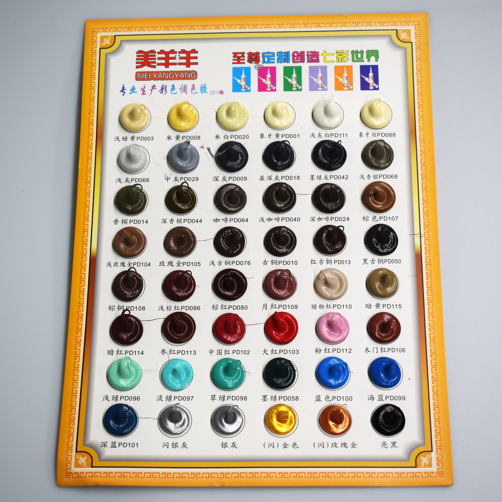 美羊羊品牌是专业的彩色玻璃胶品牌 色卡提供48种颜色可供选择 色卡上的颜色全部为现货库存,若订单数量过大导致库存不足最多3天可以发出 如果客户颜色比较特殊也可提供调色,起调量为20箱